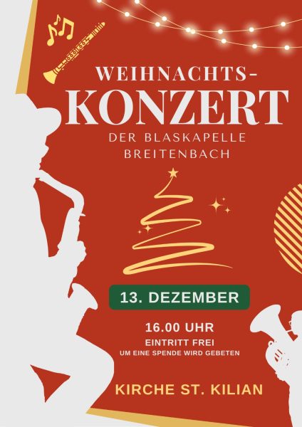 Weihnachtskonzert der Blaskapelle Breitenbach in der Kirche St.Kilian am 13.12.2025 um 16 Uhr 24.11.202524.10.2025
